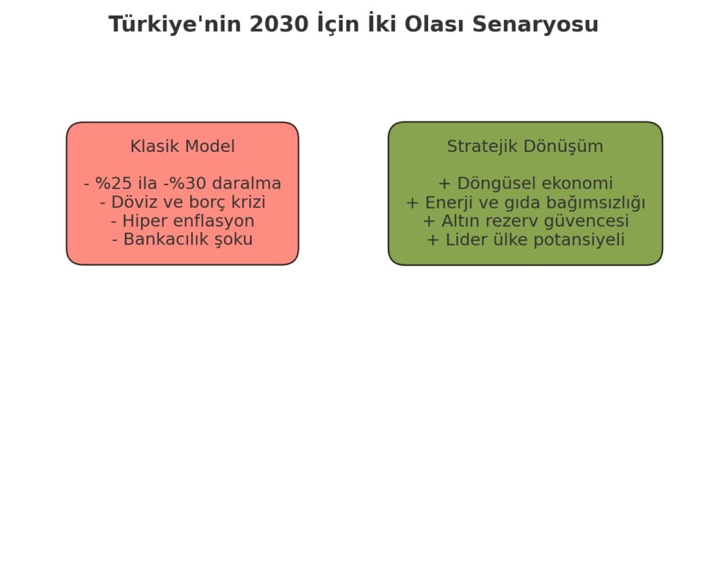2.Ama doğru hamlelerle(özellikle 2025-2027 döneminde eşzamanlı yapılması halinde) ,yani yeşil-döngüsel ekonomiye, su-gıda-enerji bağımsızlığına, yeni rezerv sistemine erken geçiş ve özellikle bankacılık sektörü + merkez bankası altın rezervlerini bu dönemde artırırsa (yani krize güçlü altın stoğu ile girerse); o zaman bu kaosu -fırtınayı fırsata çevirebilir ve 2030 sonrası yeni dünya düzeninde 5 lider/öncü/yönlendirici ülkeden biri olabilir.