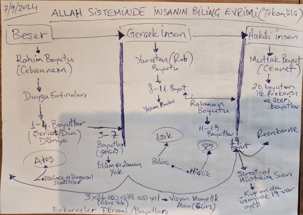 İşte metaforik olarak cennet diye tanımlanan bu üst boyuta geçiş için de varlık olarak yolculuğumuz BİLİNÇ DÜZEYİ/aşamaları açısından, “ (1) BEŞER olarak başlamakta, sonrasında defalarca yaşadığımız enkarnelerle bilinçlenerek önce (2) GERÇEK İNSANA dönüşüyoruz, en sonunda da nihai hedef (3) HAKİKİ İNSANA ulaşıyoruz ”.