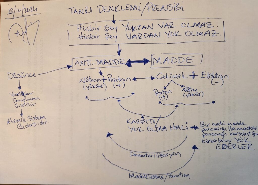 Her şey (her varlık ve kozmik yapılar) anti-madde(düşünce) ile madde arasında alt sonsuzdan üst sonsuza doğru sürekli artan/gelişen/tekamül eden bir sonsuzlukta her daim daha üst boyutlara var ile yok arasında dönüşerek (dönme-döngü-denge ile )TANRI’ya erişmeye çalışır ve ilerler.